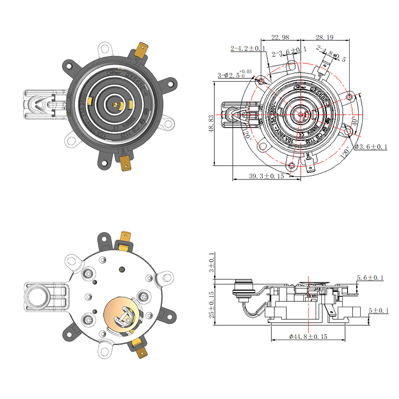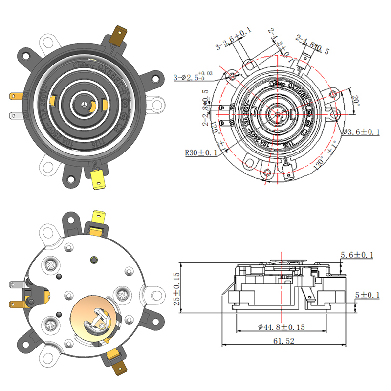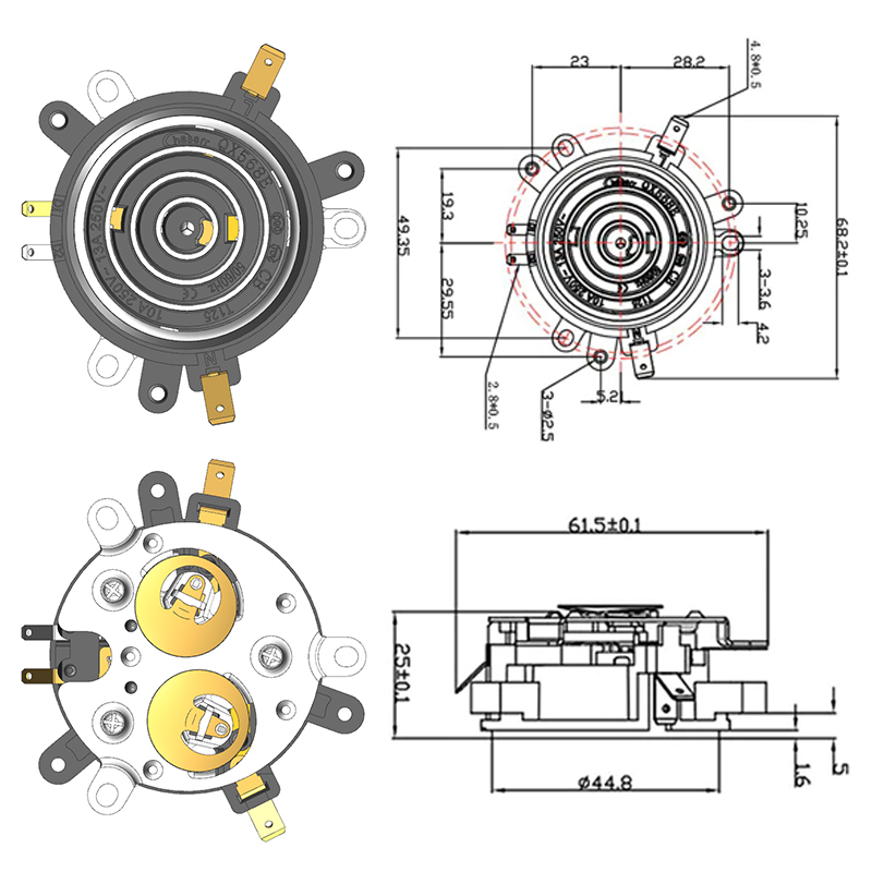 From a materials and manufacturing standpoint, the housing is molded from high-performance glass-filled nylon or phenolic resin, materials chosen for their good resistance to heat, moisture, and mechanical wear. The molding process incorporates snap-fit hooks, keying tabs, and alignment guides, enabling automated assembly lines to seat the base quickly and accurately without imparting undue force on internal conductors. At the same time, the internal cavity is engineered with labyrinth seals or weep channels to effectively divert steam and moisture away from conductive paths, thus preserving dielectric integrity in compliance with IEC 60335-1 and UL 376 standards. Ensuring moisture protection is critical in kettle applications, where steam condensation is relentless, and even a tiny conductive path due to water vapor could compromise both performance and safety; Qianxun's solution lies in proven water ingress mitigation built directly into the base's design.